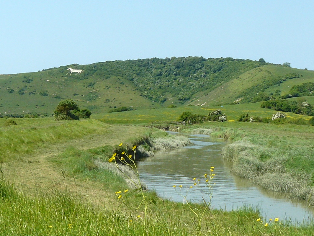 Not being one ever to decline any form of challenge and with a daysack, map and and some gentle banter, we set of down a bridle path towards Alfriston. As we descended the old chalk drovers road, my mind drifted back to the days of a 14 yr old lad, for I once use to move cattle from high above the long man on Windover Hill down this very track to drive them over the valley to Kingsride. This was fraught with danger as the cattle moved fast and without do care or concern to young boys as the farmer rode behind them bibbing the horn of the Land Rover and laughing as we scurried along dodging the waste product of the enormous quantities of wild garlic that seemed to leave the cattle as fast as it was taken in !!